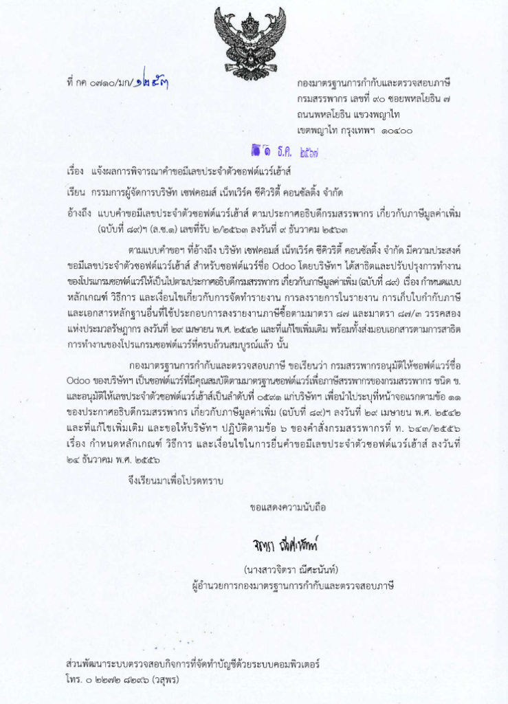 Our Odoo Thai Accounting module is officially certified and approved by the Thai Revenue Department, ensuring complete compliance with Thai tax regulations and e-Tax e-Filing requirements